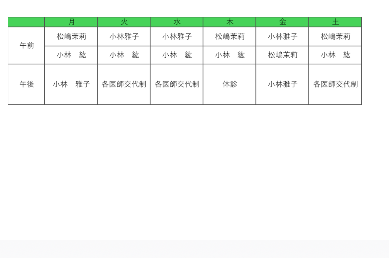 院長の体調不良により、引き続き5 月以降もは診療を控えさせていただく予定となっております。また、小林紘医師が5月より常勤体制となりました。よって、下記のとおりに診療体制を変更させて頂きます。
