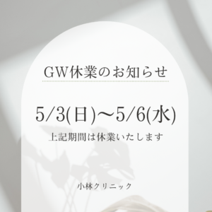 年末の休院のお知らせ 2024 11/29 お知らせ 2024年11月29日 大変ご迷惑をおかけしますが、下記の日程で休院とさせていただきます。2024年12月29日〜2025年1月4日 お知らせ 休院日のご報告 診療体制の変更について 関連記事 GW 2026 の休診のお知らせ 2026年4月13日 雅子先生 4月休診について 2026年4月13日 令和8年4月 紘医師休診について 2026年3月20日 令和8年度 診療体制変更のお知らせ 2026年3月20日 令和7年度末の休診期間のお知らせ 2025年11月24日 外来診療体制の変更について 2025年9月7日 令和7年度夏季休暇について 2025年6月4日 当院の院内掲示 2025年5月23日